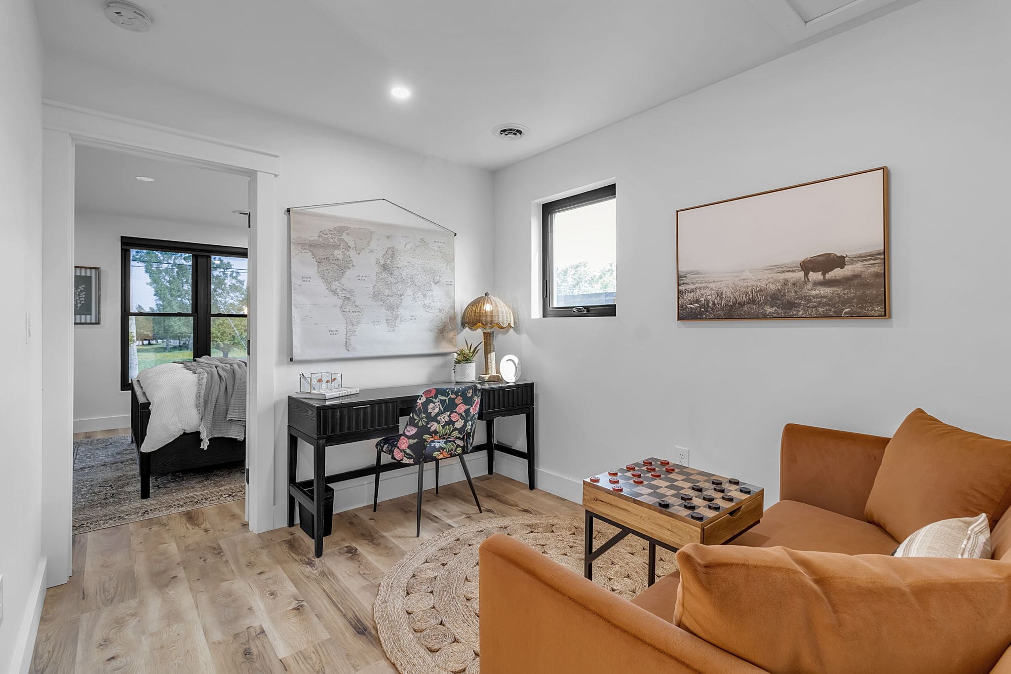 A modern 2250 sq ft home with 6 beds, 2.5 baths, two living rooms, and a private backyard — perfect for families, groups, or business travelers.