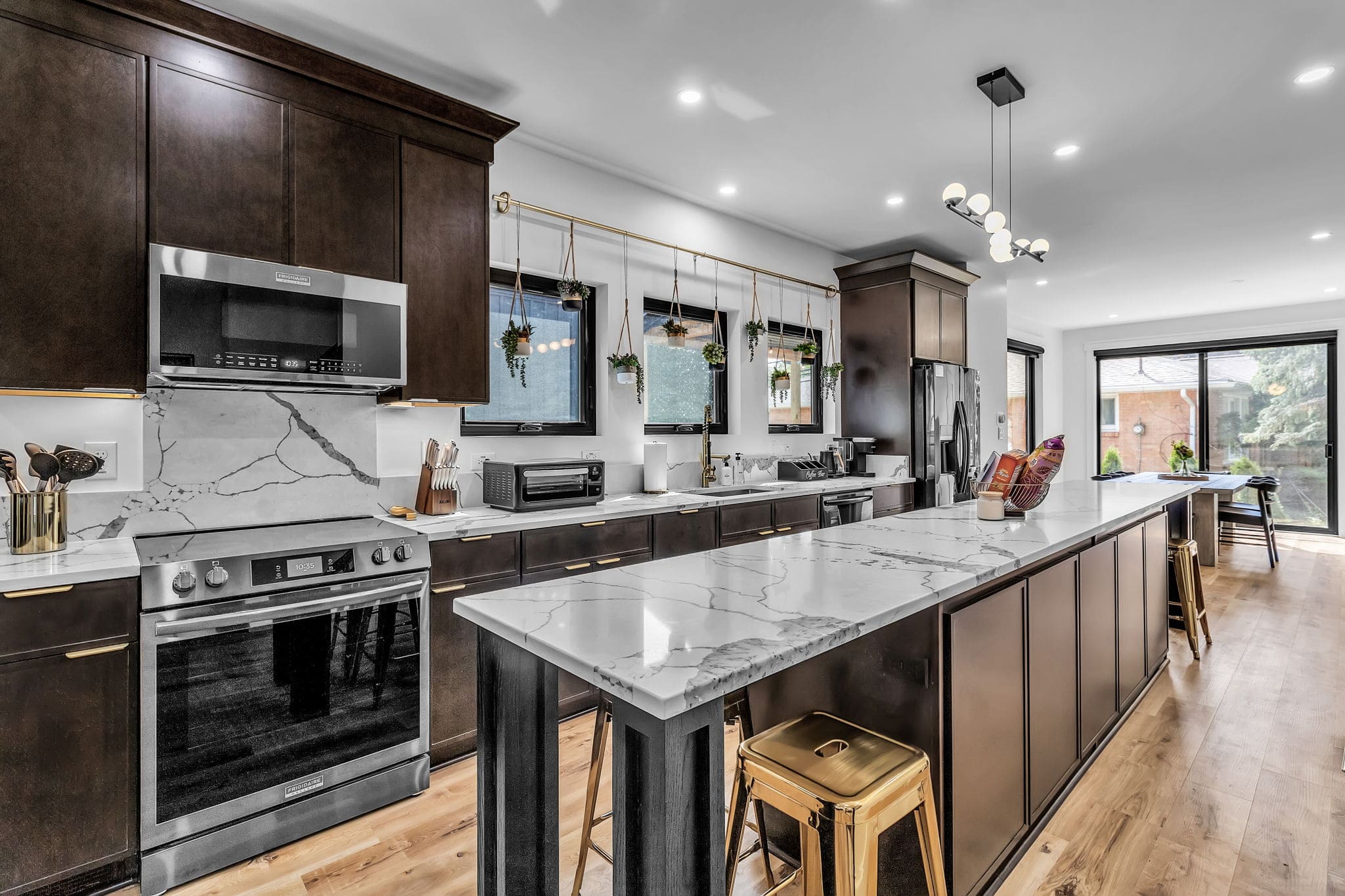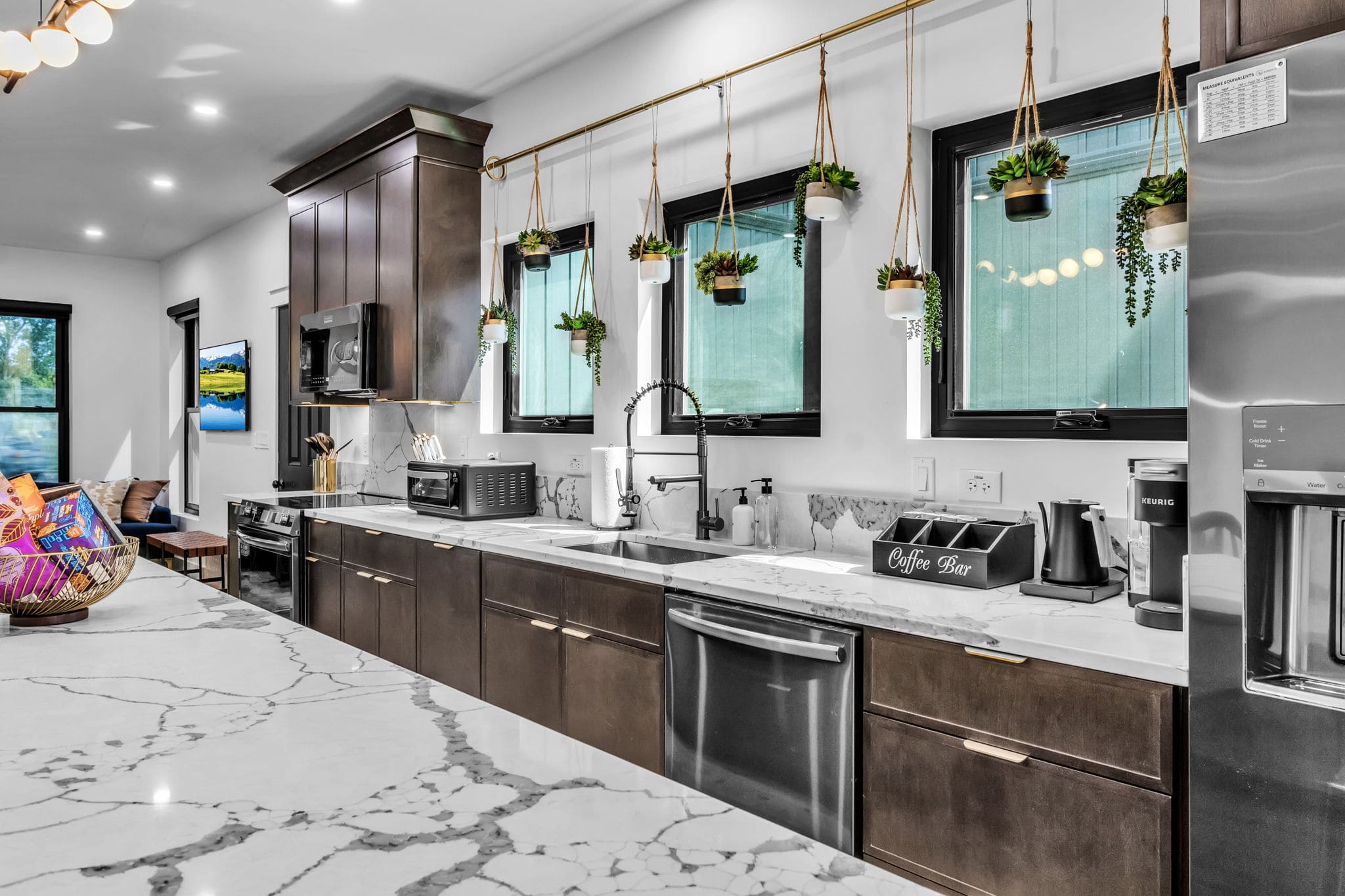 Fully equipped with appliances, island, and pantry for cooking and meals.